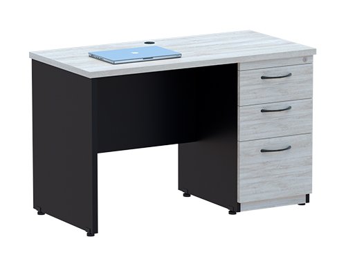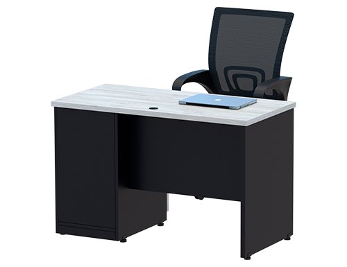 Medidas: Escritorio principal recto de 1.20 x 0.60 x 0.75 m cuenta con cajonera fija de 2 cajones papeleros 1 cajón archivero, cerradura general, grommet pasacables giratorio y niveladores de piso.